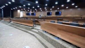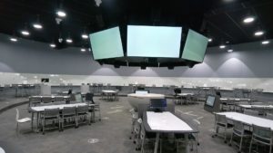 ランチに引き続き、ディスカッションとなったが、その前に新築の校舎を案内してもらった。写真は、大教室のものだが、協働を生み出すデザインとなっていた。2枚目の写真の通り、吹き抜けのあるスペースで、感性が刺激される色使いであった。3枚目の写真は、大教室であったが、可動式の椅子のため、話しやすいようなデザインであった。4枚目の写真は、それよりももっと大きな部屋であったが、グループワークができる机の配置に加え、それらを全体に共有できるデザインとなっていた。教室の理念や考え方、デザインの彼我の差異を目の当たりにすることができた。