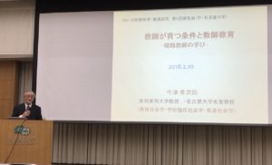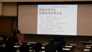 初日の最後は、愛知東邦大学の今津先生による講演「教師が育つ条件と教師教育」で締めくくられた。研究者としてのライフヒストリーの中での教師たちとの出会い、そこから得られた教師の学びを御著書の内容を交えながら熱く語られた。