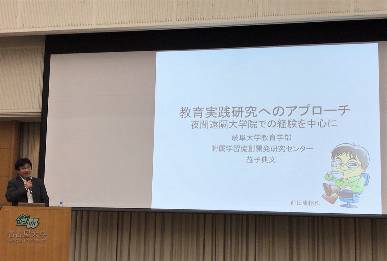 続いて、岐阜大学の益子先生から「教育実践研究へのアプローチ -夜間遠隔大学院での経験を中心に-」と題した講演を行って頂いた。大学院で現職教員とともに学び続けてこられた経験を研究としてまとめられた内容を基にしたものであり、非常に学ぶべき点が多くあった。