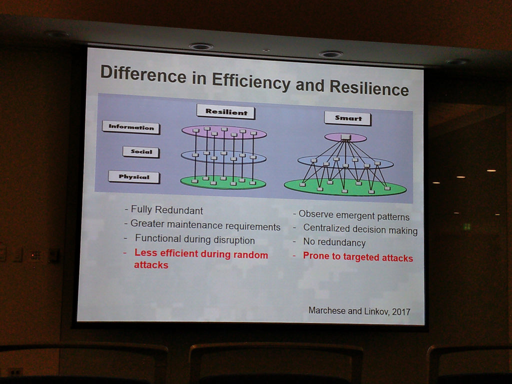 興味深かったのは、効率性よりもレジリエンスが重要という点である。例として交通システムと生産システムの話が挙がっていたが、効率化を行えばラインを一本化する方がよくなるが、不測の事態が起こった場合に失われるコストやロスが極めて大きくなる。現実に起こり得ることを理論的にモデリングとして実現しようというのが登壇者からの話題提供だった。