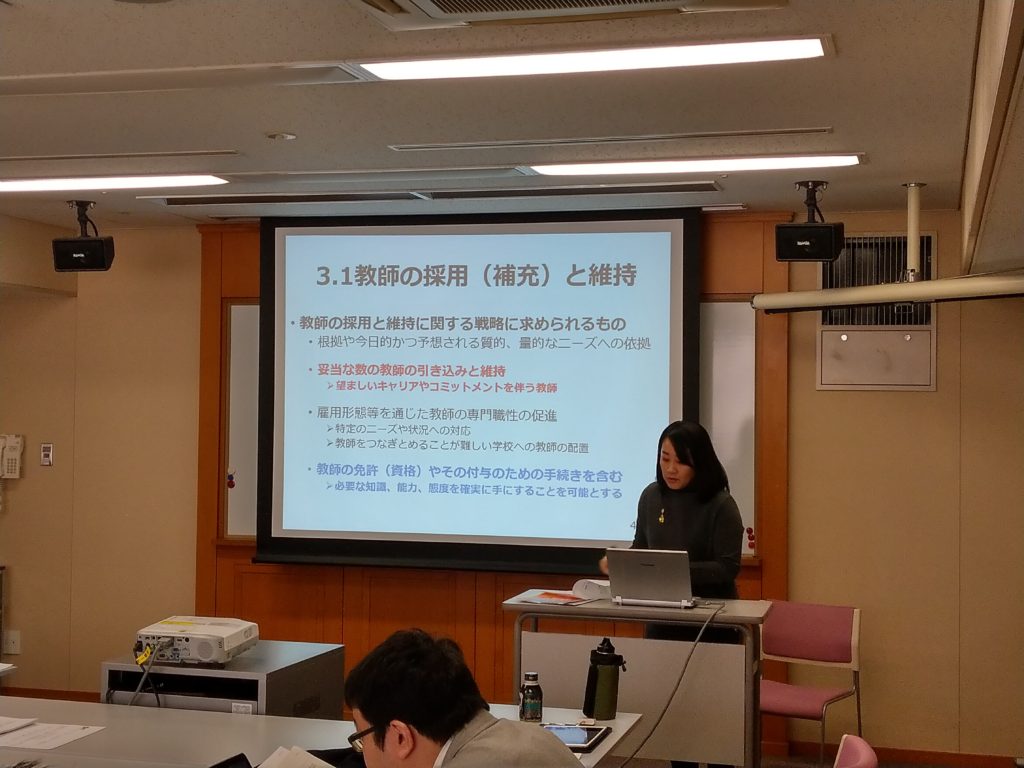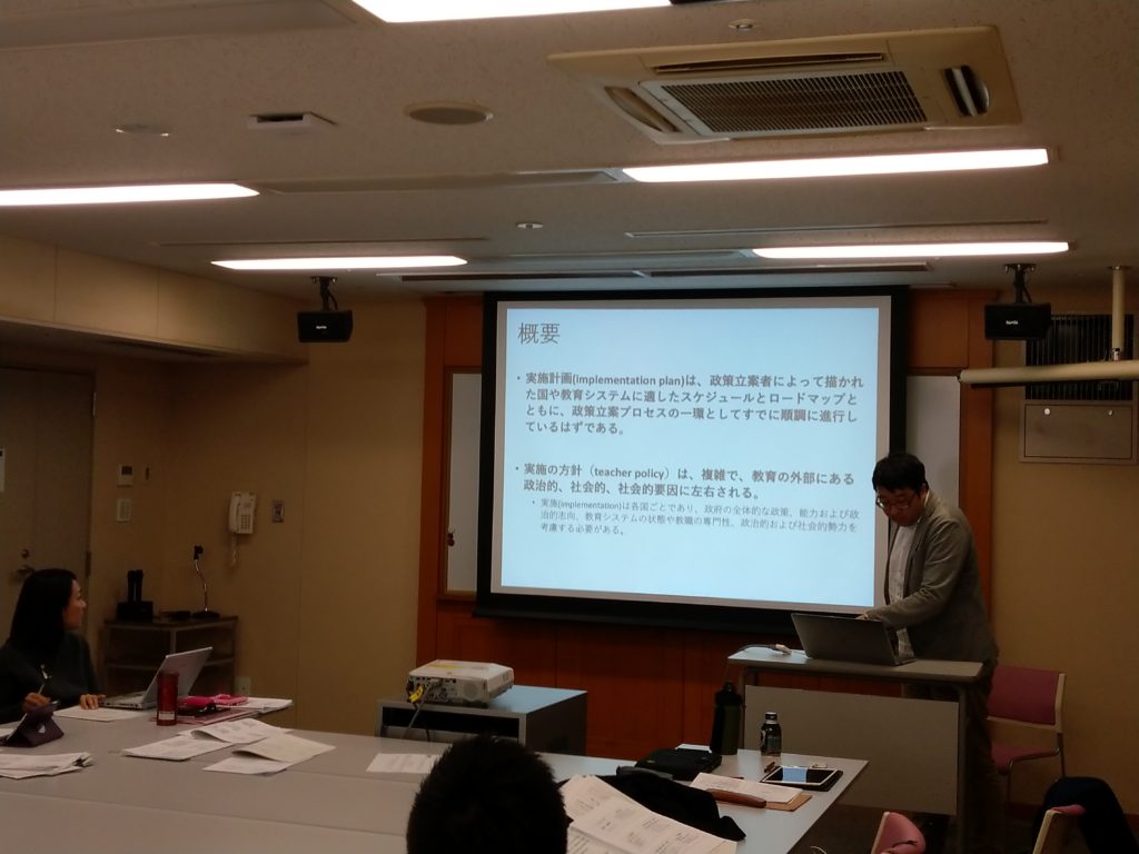引き続き、大阪市立大学の森さん、島田さん、神奈川大学の望月さん、横浜国立大学の脇本さんからUNESCOの”Teacher Policy Development Guide”を紹介して頂き、教師教育に関する基盤となるフレームワークを共有した。お一人あたり35分という限られた時間しかなかったので、5-10分程度の質疑・議論を挟むという形になった。