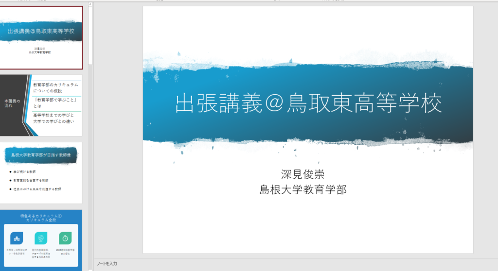 鳥取東高等学校出張講義についてもオンラインでの開催(Meetを用いての遠隔開催)となった。同一内容を2セッション担当し、学部の説明、教育学を学ぶことの意義等を生徒に伝えることができた。質疑についてはやはり出しにくいようだったのでその点が課題だった。