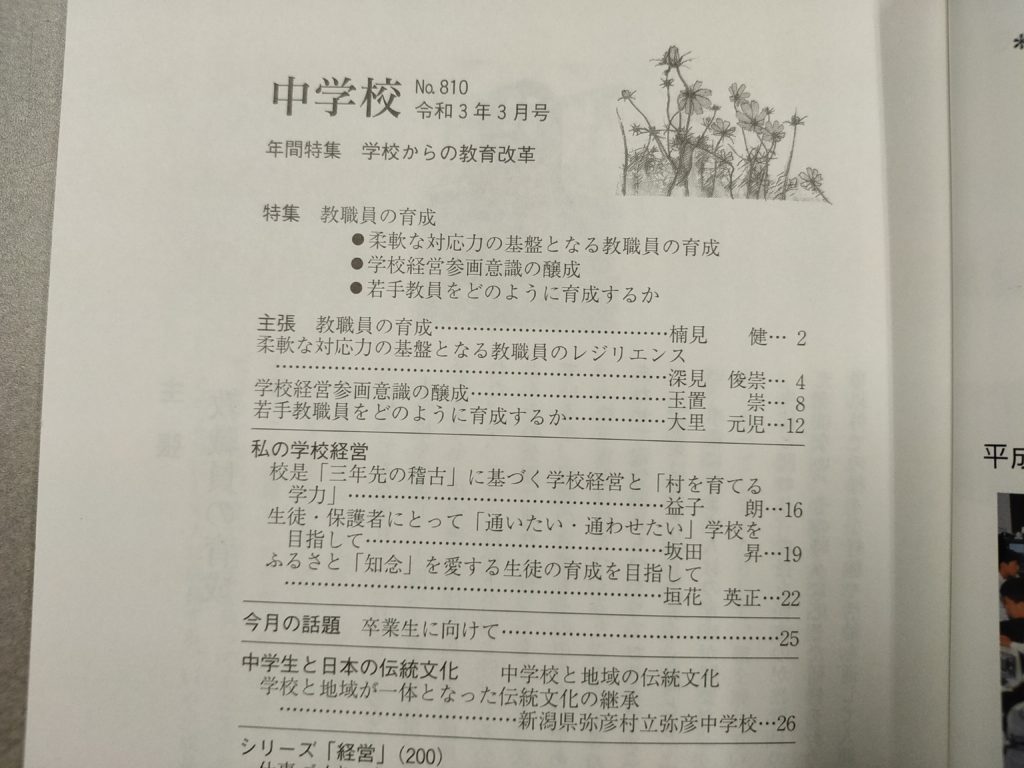 全日本中学校長会の機関誌「中学校」に「柔軟な対応力の基盤となる教職員の育成」というテーマで教職員のレジリエンスに関する内容を寄稿させて頂いた。 教職員のレジリエンスの重要性、拙編著『教師のレジリエンスを高めるフレームワーク』の基盤となる”BRiTE”の概要、そして、レジリエンスに資するリーダーシップについて簡潔に紹介した。