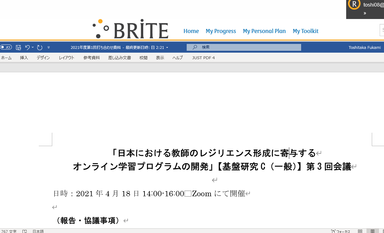 4/18は休日出勤し、自身が代表を務める科研「日本における教師のレジリエンス形成に寄与するオンライン学習プログラムの開発」のミーティングを行った。昨年度からの継続案件と今年度の展開について色々ご意見を頂くことができた。今年度は、オンライン学習プログラムの最初のバージョンを開発予定なので、様々な取り組みを進めていかねばならない。