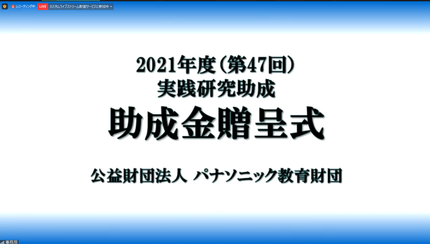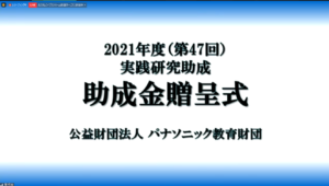 5/28は、パナソニック教育財団・助成金贈呈式であったが、昨年度に引き続き今年度もオンラインの開催となった。