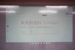 6/3の午前中は、前期課程南校舎の「未来創造ラボ」で行われた後期7年生の未来創造科の授業参観であった。スタート段階の活動だったが、グループワーク等も良い形で進んでいた。当初、グループでの集約にJamboardを用いる予定だったが、こちらのWi-Fiとの接続が上手くいかず、1グループのみで他のグループはホワイトボードを用いる形となった。それでも、各グループとも充実した議論につながっていた。