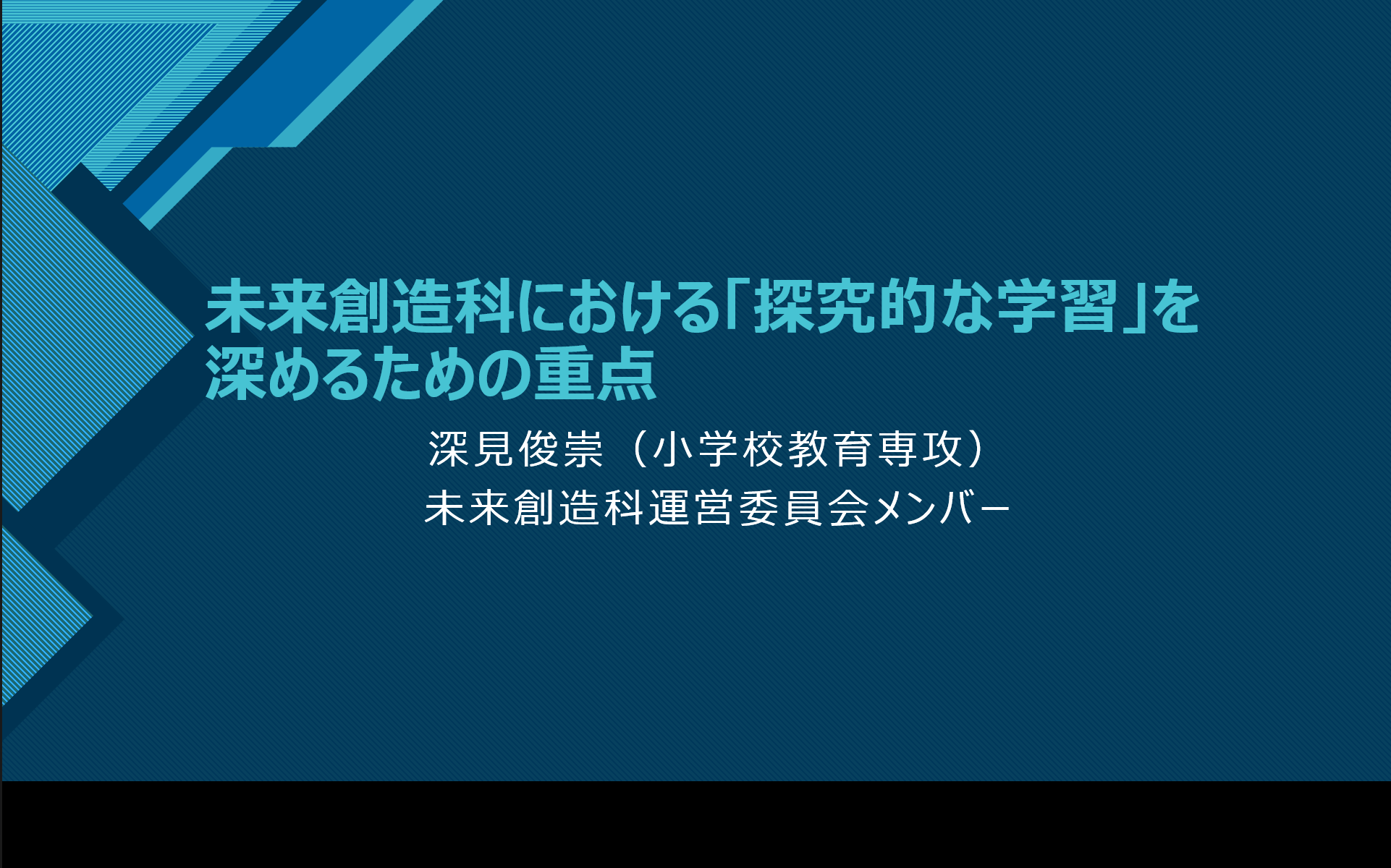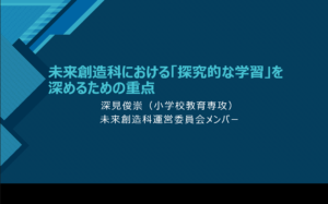 未来創造科運営委員会メンバーとして「未来創造科における「探究的な学習」を深めるための重点」と題して、25分間話題提供させて頂いた。