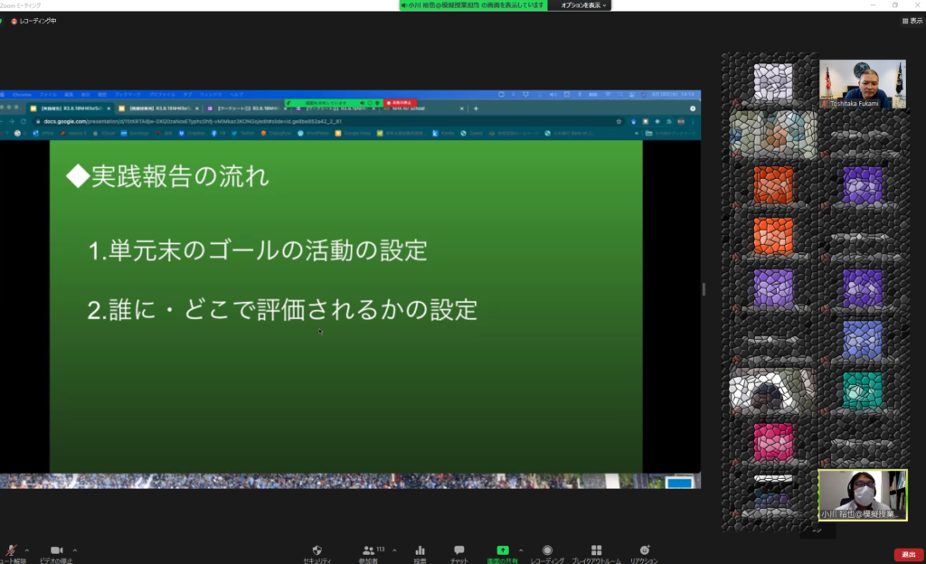 全般的に時間が足りない印象だった(若干詰め込み過ぎた)こと、特にグループワークの時間確保が十分できなかったことが課題であった。 内容としては実践提案・模擬授業と自身の話題提供・グループワークがつながる形だったので学びがいがある内容だったと思う。