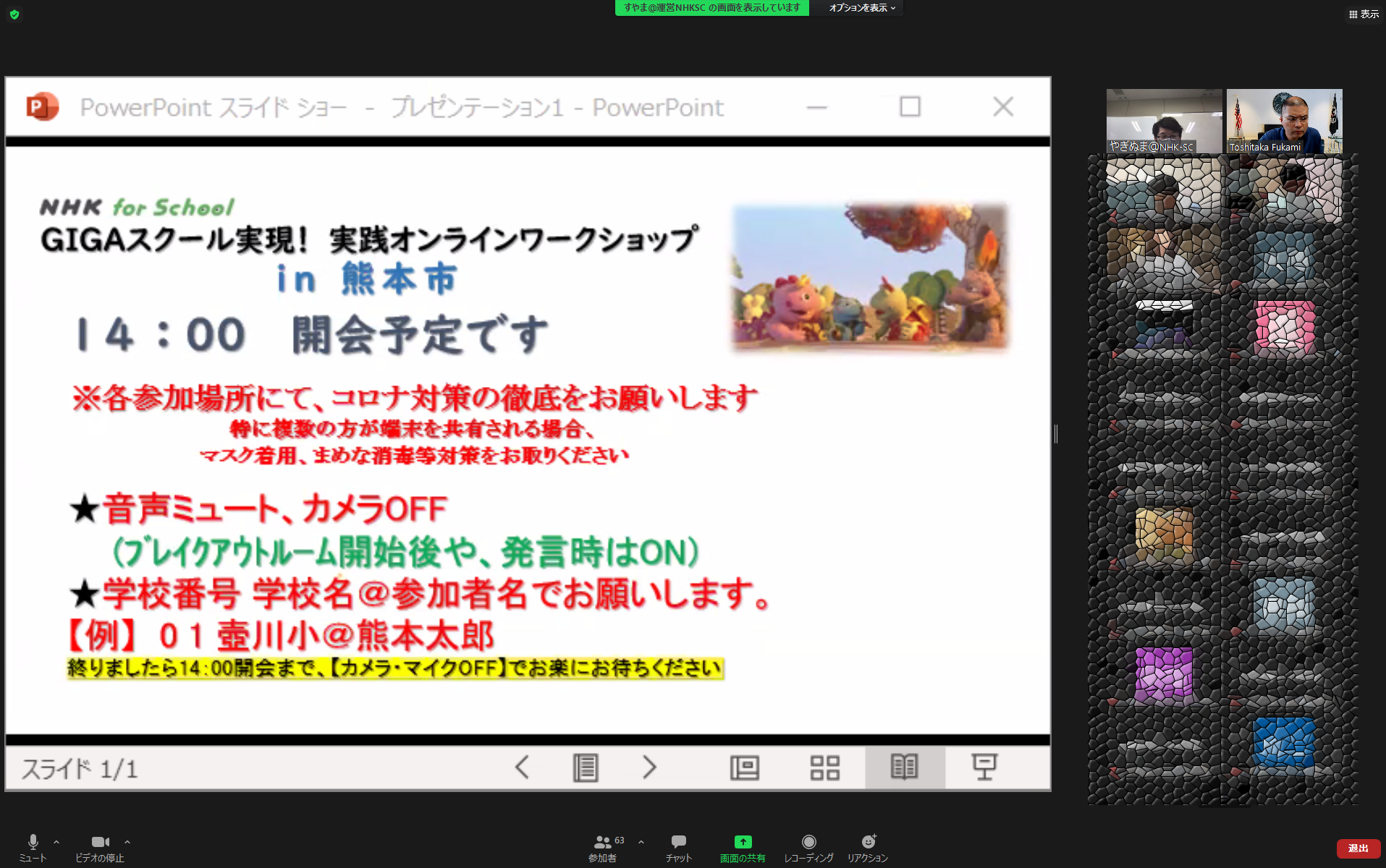 全体コーディネートと後半のワークショップを担当させて頂いたNHK for School実践ワークショップ@熊本が本日開催されたが、現地には行けずオンライン参加となった。先生方も各学校からZoomでアクセスしての参加であったが、総勢約100名という大規模な研修となった。11時半から12時半までリハーサルを行った上、14時から2時間半の時間でワークショップは行われた。
