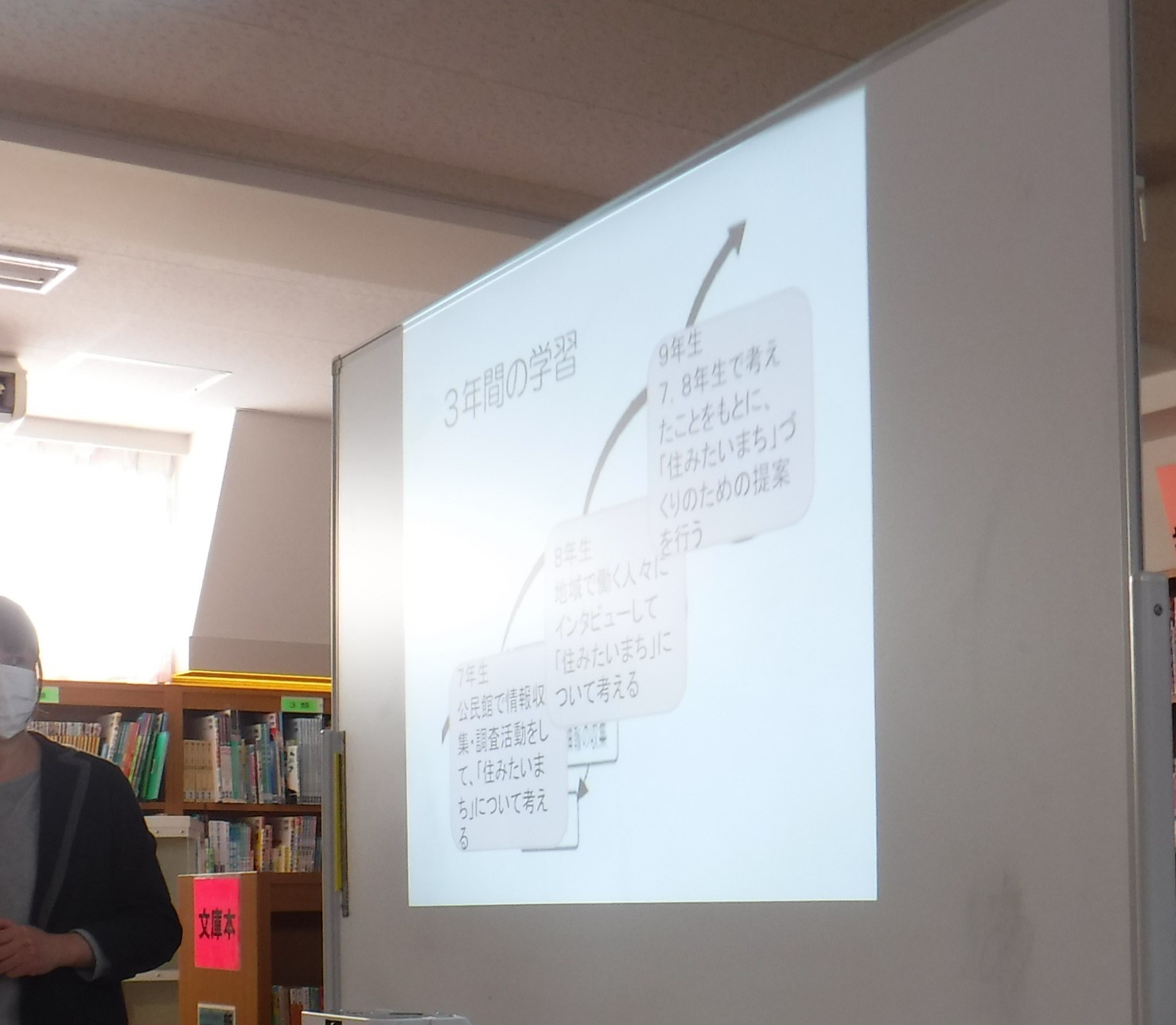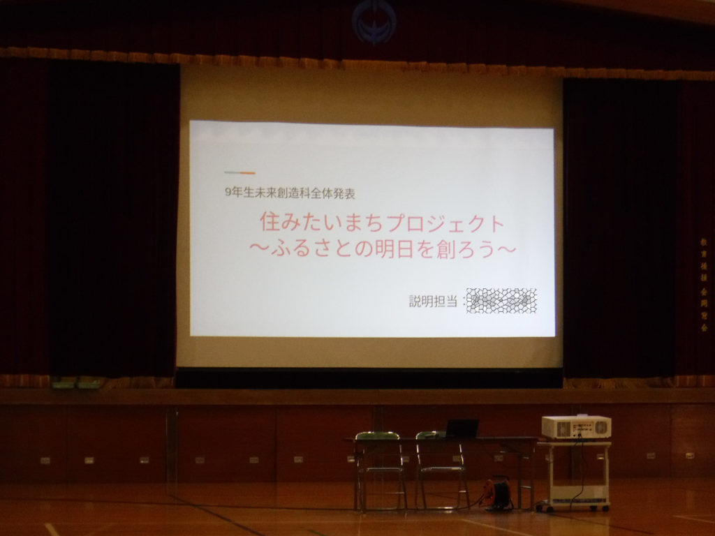 全体会では、生徒の代表が9年生の取り組みについて説明した上で、5つのカテゴリー(環境とエネル、,福祉・ 医療・ 保健、人間とコミュニティー、まちの安全・安心、産業と観光)の代表者がそれぞれの取り組みについて概要を説明した。後期課程の未来創造科については、「住みたいまちプロジェクト―ふるさとの未来を創ろう」をテーマとしており、9年生は「他と共に社会に参画する」ことを目指し、各カテゴリーのテーマに即し、数名のグループで「社会参画活動」に取り組んできた。