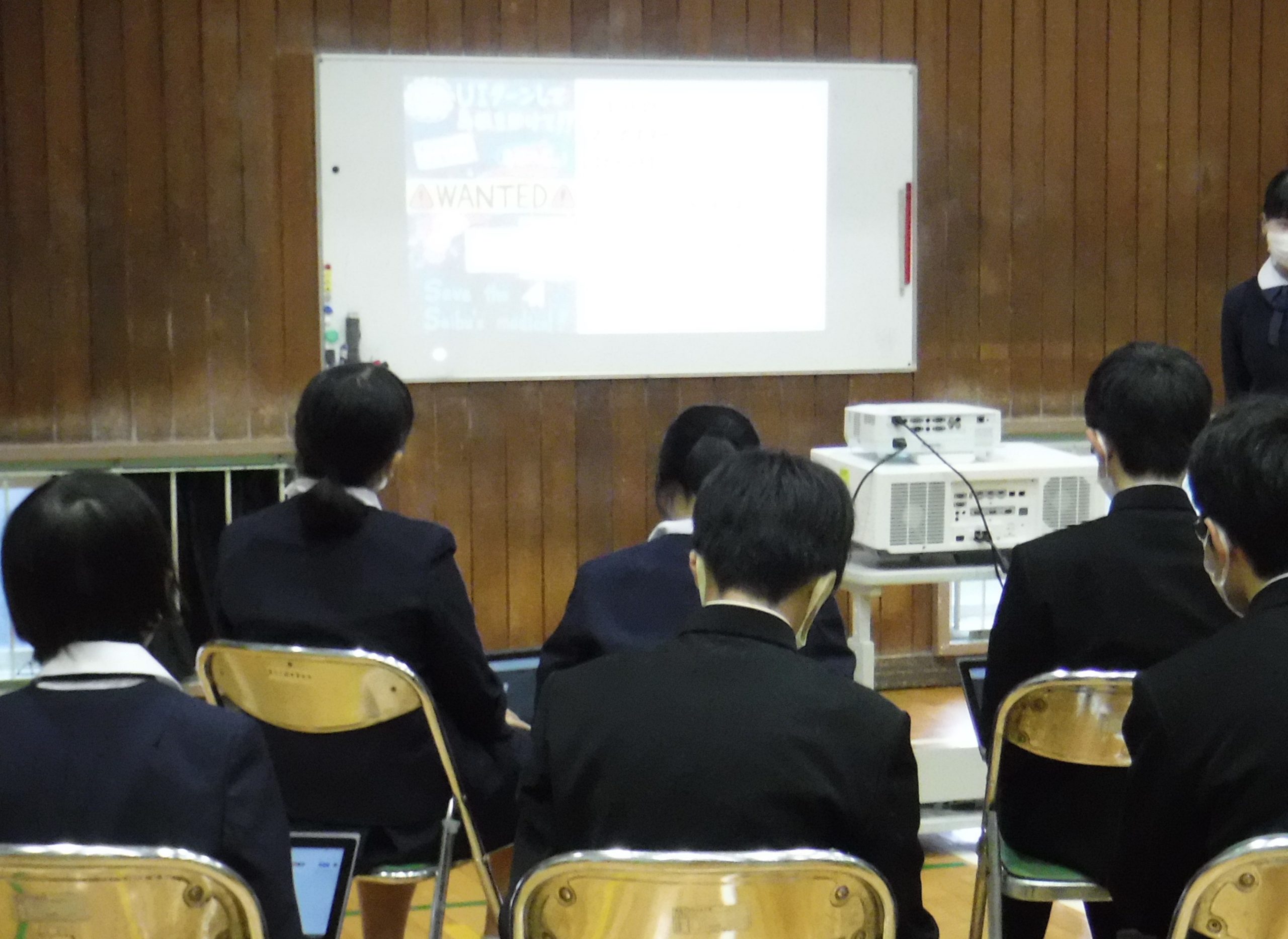 全体会の後、各教室・特別教室・体育館の複数会場で、9年生1人1人が自分たちの取り組みを各自のChromebookを用いてプレゼンを行った。各会場は、同じ活動が重ならないように配当されており、他の9年生と8年生に対して、啓発ポスターの作成、清掃活動の従事等、コロナ禍で制約もあったがそれぞれ工夫しながら自分たちの取り組みを伝えていた。