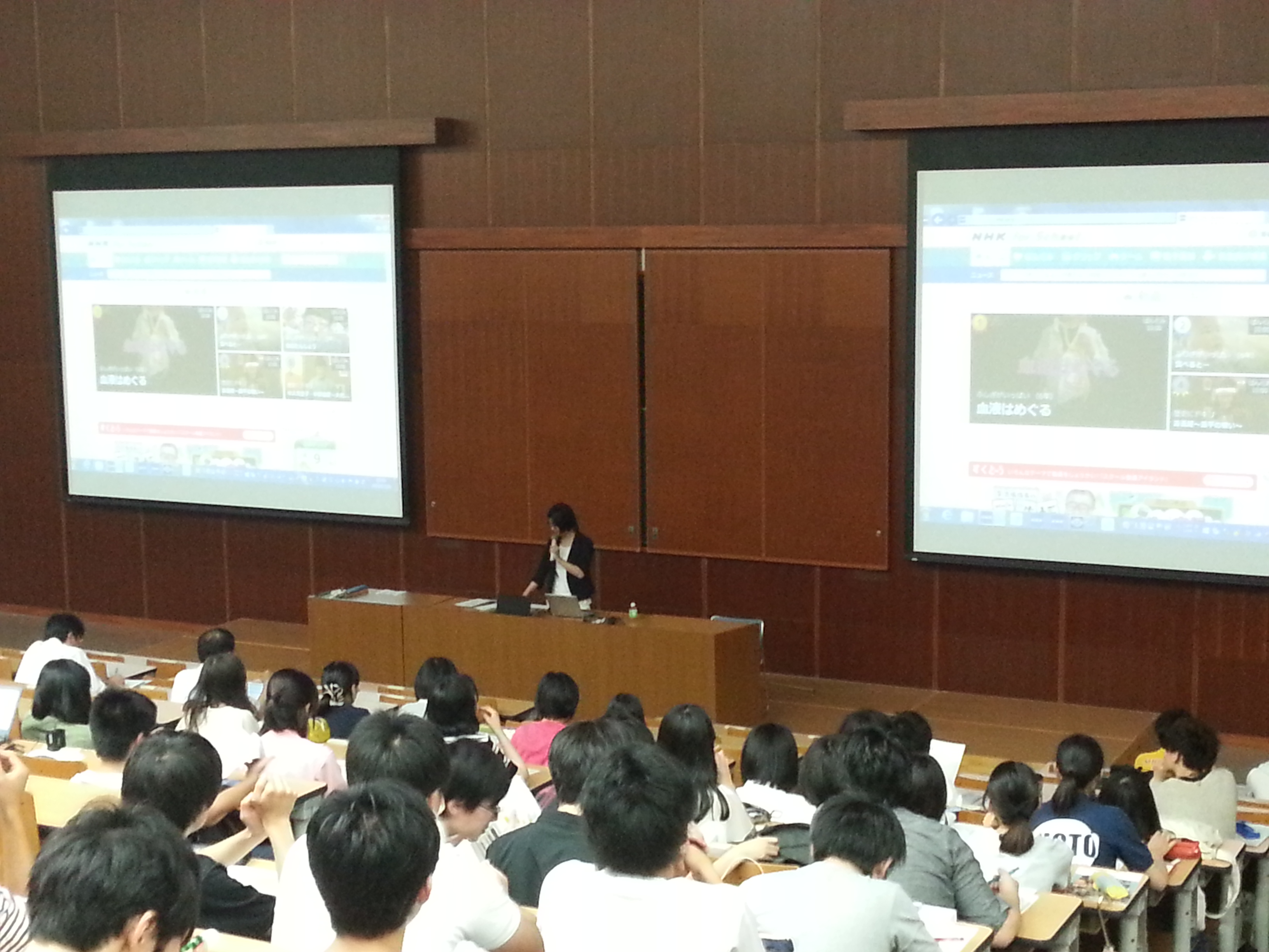 7/9の6コマの時間帯に「初等教育実践基礎4」「教育の方法及び技術(初等)」の補講としてNHK for School基礎セミナーを開催した。NHKサービスセンター放送教育推進部の担当者からNHK for Schoolの概要、スマートフォンでの利用、実践紹介などがコンパクトかつわかりやすく説明され、非常に充実した内容であった。